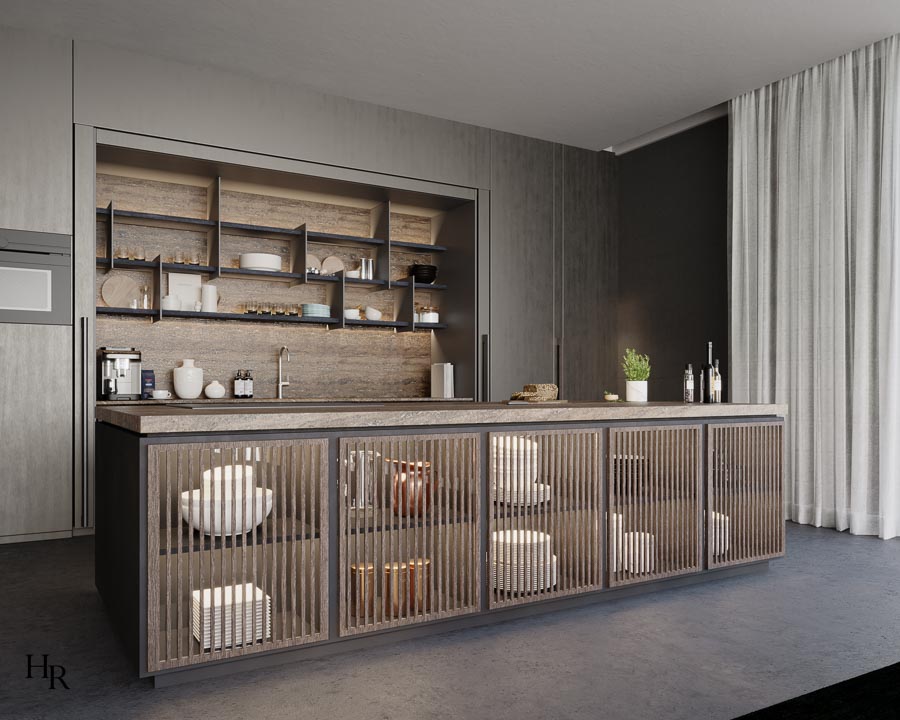 Die Küche von Dada/ Molteni, kann dank der praktischen Faltschiebetüren komplett geschlossen werden, um ein nahtloses Erscheinungsbild zu schaffen. Bei den verwendeten Materialien stehen dunkles Holz, Travertin, Leinen- und Baumwollstoffe sowie bronzefarbenes Metall im Vordergrund. Diese Kombination erzeugt eine warme und einladende Atmosphäre.